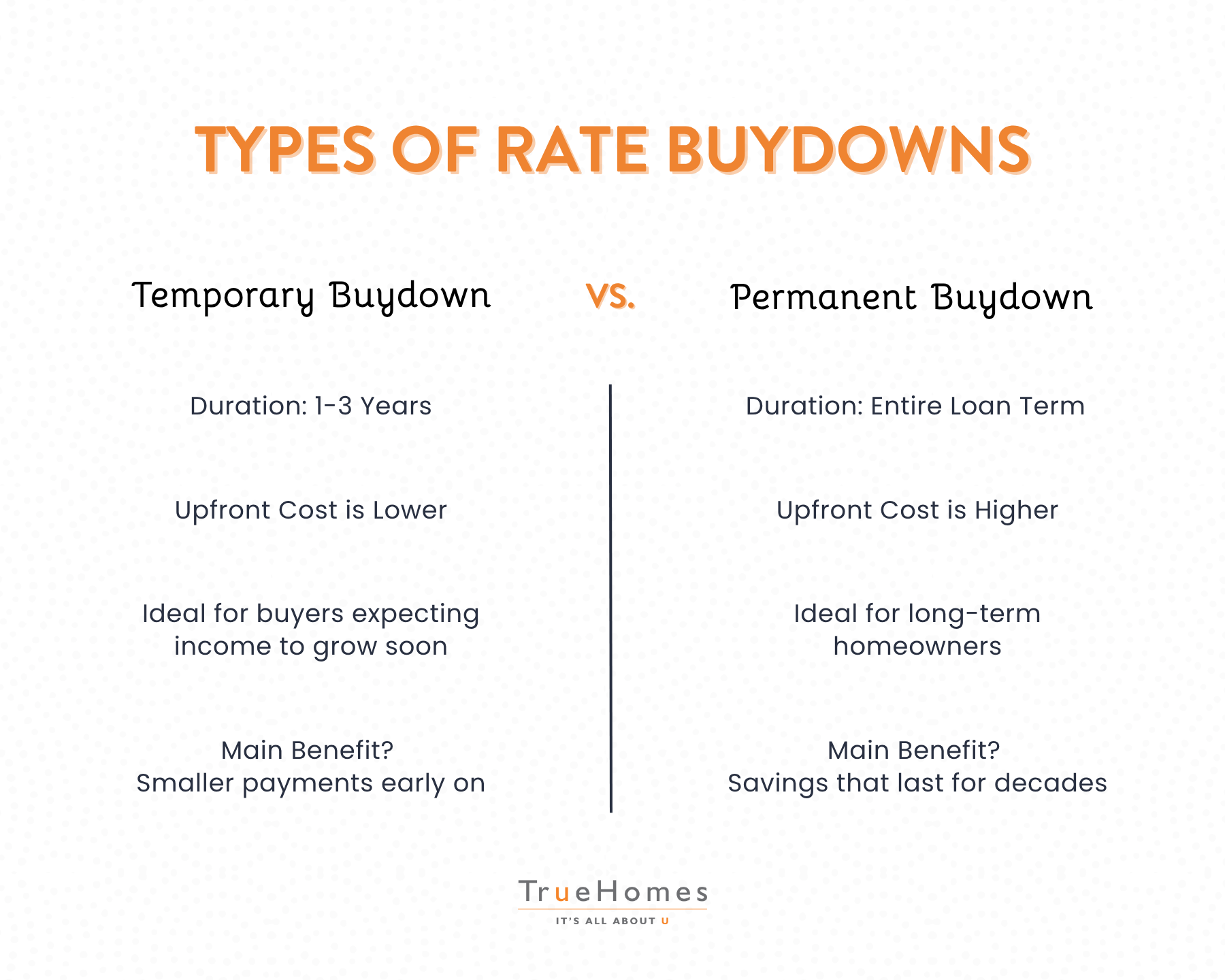 - Permanent Buydown: Long-term savings; higher upfront cost.